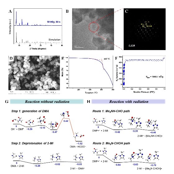 在本工作中,研究团队首先通过理论计算证明了辐射合成路径的反应活化能显著低于溶剂热合成,为MOF的辐射合成提供了理论依据。进一步地,使用1.5 MeV 电子加速器,在室温常压下快速合成了MOF材料。相较于传统MOF的溶剂热合成,辐射合成可以降低近两个数量级的能耗,并具有高的时间空间产率。此外,该方法具有良好的普适性,可以实现HKUST-1, ZIF-7, ZIF-67, UIO-66, NU-1000, Zn-BTC, MOF-73, MOF-74, MIL-53, MIL-100, 和MIL-101等十余种MOF材料的室温常压合成,可以将其作为MOF绿色合成的新路径,实现了MOF材料的批量合成。