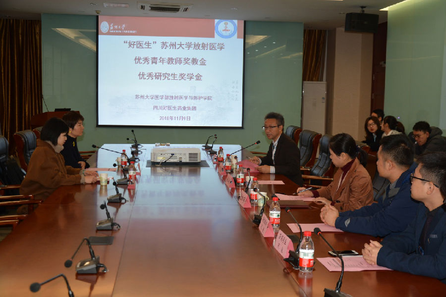 11月9日上午,“好医生”苏州大学放射医学优秀青年教师奖学金、优秀研究生奖学金颁奖典礼在苏州大学独墅湖校区学术报告厅成功举行。苏州大学放射医学及交叉学科研究院放射生物学中心副主任周光明、国家重点实验室综合办公室主任徐加英、办公室主任朱本兴、“好医生”集团代表、获得本次奖学金的老师和同学、学院研究生代表等参加了颁奖典礼。会议由周光明教授主持。