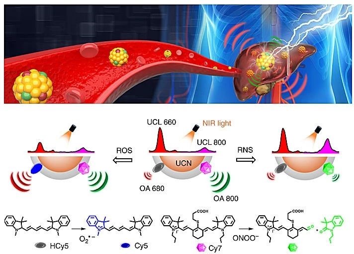 基于光声断层扫描技术(MSOT)具有的多波长吸收、深层组织穿透性以及高时空分辨率等特性,该研究团队利用稀土上转换荧光纳米粒子(UCNs),设计了一种新型的纳米探针用于多波谱光声和上转换荧光信号的实时采集和动态成像,并以此来实现多种自由基的同步跟踪并动态剖析其与药物诱发的病理损伤之间错综复杂的相关性(图5)。他们选择了两种分别对ROS(e.g., O2•-)和RNS(e.g., ONOO-)高度敏感的花青染料(HCy5和Cy7)并装载在纳米探针表面,其中HCy5会经历ROS氧化引发的结构重排并呈现增强的吸光度,而Cy7会受到RNS诱导的分子断裂而导致吸光度的降低,这种反向的变化使得利用MSOT技术实现多种自由基变化的实时比率跟踪成为可能。同时,由于染料吸收光谱与纳米载体的上转换荧光光谱(660 nm和800 nm)之间特异的荧光共振能量转移(LRET)过程,使得该探针可以利用具有深层穿透性的上转换荧光来进一步监测自由基信号的变化过程。在活体研究中,他们以小鼠药物性肝损伤为模型,对不同肝毒性药物诱发肝脏炎症过程中产生的ROS和RNS进行同时跟踪扫描,并发现在不同药物刺激下氧氮自由基之间的动态转化和平衡,从而为相关疾病的深层次实时病理剖析提供了理想的诊断平台。该研究成果有望作为新一代的非侵入式诊断技术,为人们深入探索相关疾病的生理病理机制、实现高通量的药物筛选和高效精准的临床治疗提供新颖的研究策略。