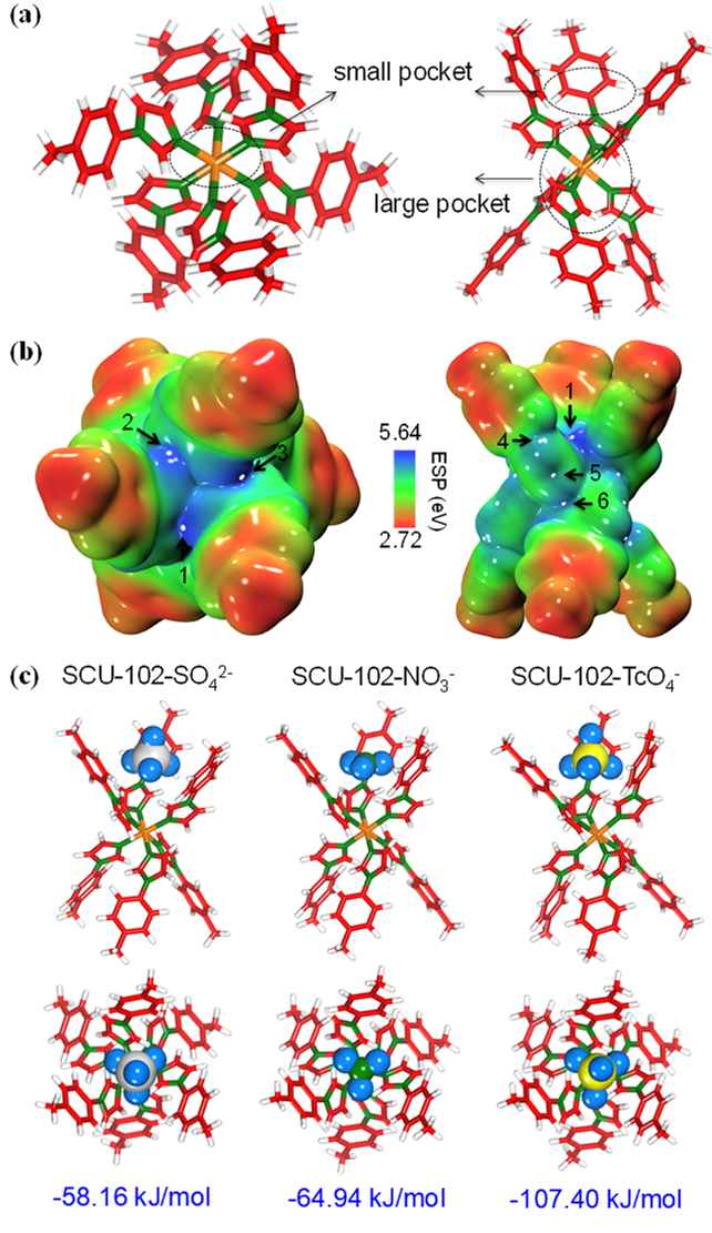 99Tc是核废料中最易泄漏的放射性核素,并且在自然环境中的迁移能力极强,几乎不受阻滞。同时还有多种大量过量的常见阴离子(NO3-、Cl-和SO42-等)与99TcO4-共存于核废液或放射性水环境中。因此,选择性高效去除99TcO4-一直是环境放射化学领域中极具挑战的难题。最近项目组报道了一例新型三维阳离子MOFs材料(命名为SCU-102),该材料具有一维有序孔道和高度对称的晶体结构,且孔道中含有游离的NO3-,可与99TcO4-进行高效的离子交换。吸附实验结果表明:SCU-102对99TcO4-的吸附动力学非常快,10分钟内即可去除溶液中几乎全部的99TcO4-,远远快于传统的阴离子交换树脂和其它阳离子MOFs材料;对ReO4-(99TcO4-的模拟物,具有相似的物理化学性质)的吸附容量为291 mg/g,高于大部分已报道的纯无机阳离子骨架材料。更重要的是,SCU-102材料是目前报道对99TcO4-选择性最高的材料。在实际受污染的Hanford地下水验证实验中,大量过量的SO42-、CO32-、SiO32-、Cl-等离子存在的条件下,SCU-102仍可高选择性地完全去除99TcO4-(分配系数Kd值高达5.6×105 mL/g)。进一步通过密度泛函理论计算阐释了SCU-102高选择性分离TcO4-的机制(图10),吸附后的结构中,99TcO4-更倾向存在于较小的“口袋”中,材料骨架的疏水性及骨架构象的匹配程度是SCU-102对99TcO4-高选择性的内在原因,并通过系统的理论计算得到了不同类型阴离子与材料骨架的结合能排序:99TcO4- (-107.40 kJ/mol) < NO3- (-64.94 kJ/mol) < SO42- (-58.16 kJ/mol)。本工作首次报道了将阳离子MOFs材料应用于治理真实受放射性污染的Hanford地下水,表明阳离子MOFs材料在环境放射性阴离子污染去除方面具有较好的应用前景。文章发表在Angew. Chem. Int. Ed.上(Angew. Chem. Int. Ed. 2019, 58, 4968 –4972)。