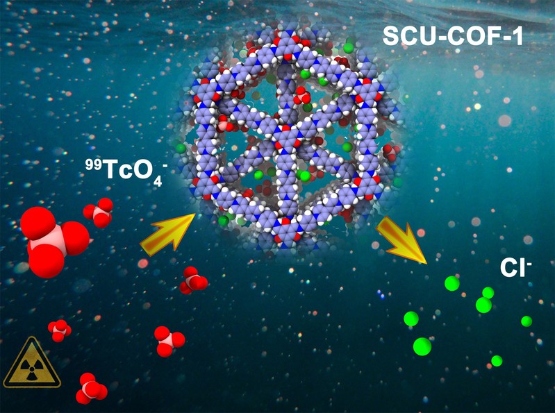 作为一种典型长寿命(半衰期2.13×105年)β放射源,99Tc具有化学毒性和潜在的辐射危害。99Tc主要以水溶性高锝酸根(99TcO4-)阴离子形式存在。99TcO4-不仅环境迁移率高难以实现玻璃固化,而且其氧化还原活性严重阻碍传统的钚-铀还原萃取过程(PUREX)中其他核素的价态转换。因此,在乏燃料后处理过程中,应及时去除99TcO4-。目前报道的阴离子交换材料在高酸度和强辐射场下难以维持结构稳定,或者对99TcO4-选择性较差。近日,王殳凹课题组合成并报道了一例全新的高度共轭的二维阳离子共价有机框架材料(SCU-COF-1),并首次将这种离子型COFs材料应用于放射性99TcO4-的去除,且通过分子动力学模拟揭示了其交换原理。研究发现,SCU-COF-1具有超高的酸稳定性 (3 M HNO3中仍能维持稳定)、大剂量的耐辐照性 (600 kGy的β或γ射线照射后维持稳定)。吸附实验表明:SCU-COF-1不仅具有极快的吸附动力学(可在1分钟内达到吸附平衡)、超高的吸附容量(高温下对ReO4-的吸附容量达702.4 mg/g ),更重要的是,SCU-COF-1对99TcO4-具有非常良好的选择性。进一步实验表明SCU-COF-1具有在模拟的高酸性乏燃料后处理溶液( 3 M硝酸)和美国遗留核场址的低活性废液中分离99TcO4-的能力。分子动力学模拟研究进一步解释了吸附机理:一方面,99TcO4-阴离子与SCU-COF-1之间结合自由能较强,随着时间的推移,SCU-COF-1中的阴离子结合位点被取代,99TcO4-成功地“挤”走Cl-从而进入到骨架中;另一方面,由于99TcO4-和Cl-之间的直接静电排斥作用,99TcO4-的逐渐占据显著削弱了SCU-COF-1和Cl-之间的相互作用,从而Cl-逐渐地从骨架中被解离。该工作不仅在离子型COFs材料上的合成上取得了突破,而且证实了COFs材料可用于高选择性分离99TcO4-的优越性,研究成果发表在国际一流化学期刊Chemical Science上(Chem. Sci. 2019, DOI:10.1039/C9SC00172G.)。