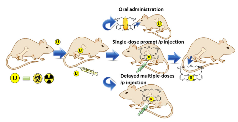 从骨骼中促排锕系元素一直是促排领域内最大的挑战,这是由于锕系元素进入骨骼中,会迅速与成骨材料如羟基磷灰石(HAP)等磷酸配体结合形成及其稳定,溶解度极低的络合物,难以排出。目前用于螯合疗法的促排剂主要是小分子配体,其促排效果主要取决于螯合剂络合锕系元素的能力强弱和选择性高低。羟基吡啶酮类(HOPO)配体是目前最具有临床应用潜力的螯合剂,毒性最低,但无法从骨骼中促排铀。针对这一问题,在前期获得的 HOPO 类促排配体与锕系元素结构和络合数据的基础上,结合实验数据和计算结果分析了HOPO 配体内部相互作用及其与铀的络合配位环境,首次提出分子内氢键对 HOPO 与铀配位的阻滞作用,打破了以往认为的分子内氢键能够提高配体刚性和结合能力的认知。通过创新性地配体设计和优化,得到新型四齿羟基吡啶酮类促排剂5LIO-1-Cm-3,2-HOPO。小鼠促排实验发现能够去除肾脏中 84%的铀以及骨骼中 55%的铀,相比于目前美国报道的最优四齿 5LIO-(Me-3,2-HOPO)骨骼促排铀效率提升了近 6倍,是首个可以大量去除骨骼中铀的 HOPO类促排剂。进一步研究发现这一配体即使口服给药或者延迟 24 小时给药,仍能够保持很高的促排效率,且对生物体内铀和钍具有很好的广谱促排效果,可以同时去除肝脏中 50%的钍,以及肾脏中近 90%的铀和骨骼中近 55%的铀。可见,该配体是目前世界范围内报道的对铀促排效果最好的四齿羟基吡啶酮的配体,在核应急方面具有极强的可操作性,具有很好的应用前景。该成果发表在Nature Comm. 2019, accept in principle.